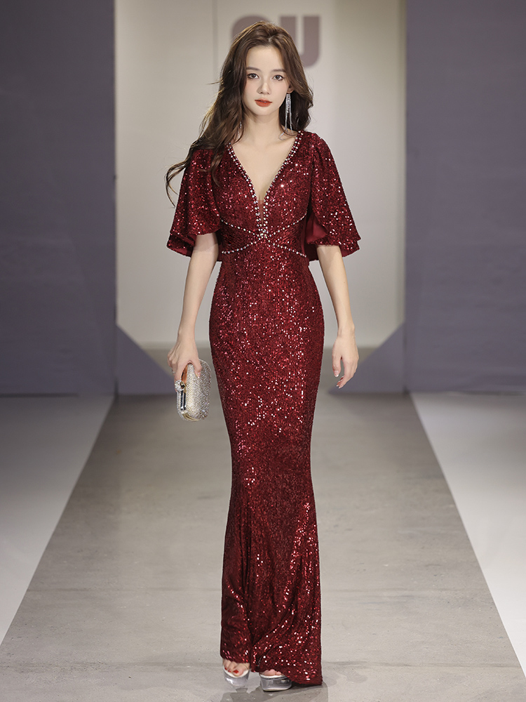 NSDLF136 酒红色亮片宴会鱼尾礼服