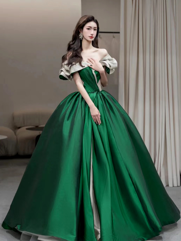 NSDLF126 绿色缎面一字肩晚礼服