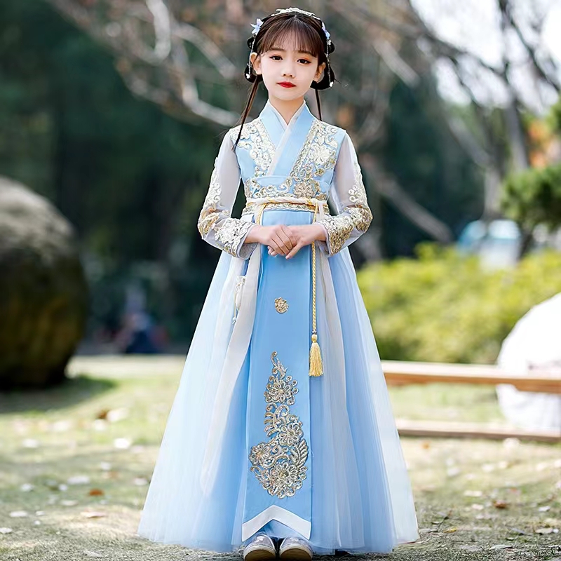 ETHF014 儿童春秋织金刺绣蓝色马面裙